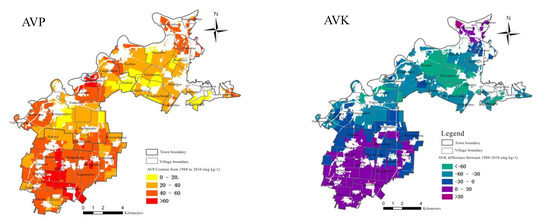Between 1980 and 2010, the content of AVP decreased gradually, but the rate of decrease differed in time. It declined to 103.62 mg/kg in 2000, then it increased rapidly by 2010, with an average value grown by 30.67 mg/kg (see Table 1 and Table 2, Figure 4 and Figures S1 and S2). The AVK was mainly distributed in Grade II and Grade III in 1980, accounting for 34.7% and 33.5%, respectively. In 2000, the AVK was mainly concentrated in Grade V (100–120 mg/kg) and Grade VI (<100 mg/kg), accounting for 47.5% and 44.9%. Compared with 1980, the AVK in soil decreased significantly. Among which, the decline range of Linhu street and most areas of Wanggangbao town was more than 60 mg/kg, the decline range of southern Wanggangbao town and northern Yongle town was between 30–60 mg/kg, and the decline range of central/southern Yongle township was between 0–30 mg/kg. However, in 2010, the dominant type is Grade III (3657 hm2) and Grade IV (3670 hm2). Compared with 2000, the increase range in Linhu street and the north Wanggangbao town is 0–30 mg/kg, while in most area of Yongle town the increase range is more than 30 mg/kg.
