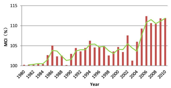 As Figure 6 shows, the MCI has been increasing during 1980–2010, presenting an increasing degree of land use overall. It may roughly be divided into three stages. In the first stage (1980–1990), the MCI increased from 100.23% to 102.96%, during which it experienced a wave in 1986 at 105.04% and a trough in 1989 at 100.16%. The second stage was from 1991 to 2000, during which the MCI was in a relatively stable status, rising from 104.41% in 1991 to 104.67% in 2000. The third stage was from 2001 to 2010, when the MCI rose sharply and then steadily. It rose from 103.42% in 2000 to 111.88% in 2010, and experienced a trough (101.27% in 2003) and a peak (112.37% in 2006). From the beginning of this century, the MCI increased significantly. In the early stage of reform and opening up, due to the limitation of climate conditions in the study area, only one crop of corn or rice can be planted. Therefore, the MCI is mainly 100%. However, with the improvement of agricultural production technology and the marketization reform of agricultural products, farmers began to plant high-value crops such as vegetables and fruits, which greatly improved the multiple cropping index of land.