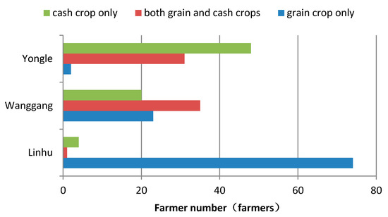 Figure 8 presents the spatial difference in land use pattern. We find that there are obvious differences in crop selection behavior. The selection of crops shifted from the single crop to three types, i.e., grain crop only, both grain and cash crops, and cash crop only. Moreover, with the increase of distance, the planting area of grain crop was gradually decreasing, while that of cash crops was gradually increasing. Among the farmers who grew grain crop, there were 74 farmers (93.7% of the samples in this town) in Linhu street, 23 farmers (29.5%) in Wanggangbao town, and 2 farmers (2.5%) in Yongle town. The farmer who plant cash crops is just the opposite