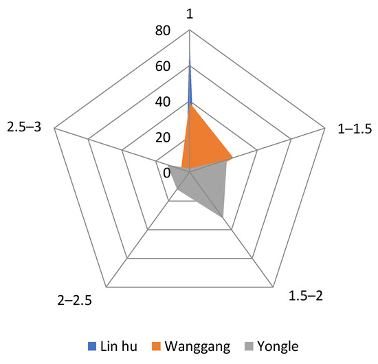 The MCI are also spatially different among the three regions (see Figure 9). A total of 74 farmers (93.7%) of the samples in Linhu street were with an MCI of 1. It followed by 39 farmers (50.0%) in Wanggangbao town and 2 farmers (2.5%) in Yongle township. But Yongle town had the highest proportion of samples with an MCI of 2.0–2.5 and 2.5–3.0, accounting for 14.8% and 16.0% of the total samples in this area, respectively.