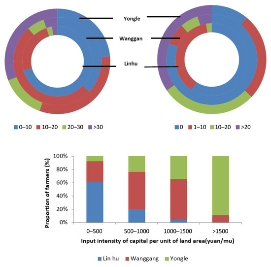 The LII mainly includes labor and capital inputs (see Figure 10). In terms of labor input, with the increase of distance from the city center, the number of family laborers increases. For example, the per mu (Mu is a unit of area in China, 1 ha. = 15 mu) input in Linhu street is mainly concentrated in 0–10 working days/mu, while that in Yongle town is between 10–20 working days/mu and above 30 working days/mu. From the aspect of capital input, there is a similar spatial differentiation trend. With the increase of land input intensity, the proportion of farmers is decreasing in Linhu street and increasing in Yongle town.