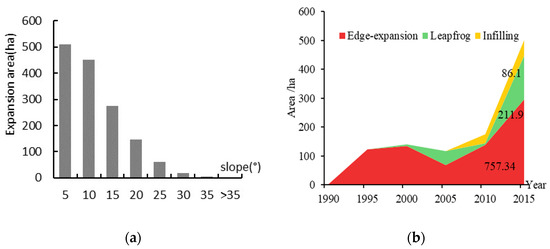 - Ecological conservation area construction. Loess Plateau is one of the regions most seriously affected by soil erosion in the world [68,69]. The Chinese government implemented the “grain for green” projection to protect the local eco-environment. However, a large amount of grassland and woodland is still used for residential land construction. There were 161.65 ha of grassland and 66.71 ha of woodland transformed into residential land in the Baota District during 1990–2015. Therefore, it is necessary to construct ecological conservation areas. The results of this study indicated that the expansion of rural residential land was mainly concentrated around the city and in the river valley, and 84.3% of the newly added rural residential land was distributed below a slope of 15°. Previous studies have found that the soil erosion-sensitive areas on the Loess Plateau mainly occur in the zones with a slope of 8°–15° and 15°–25° [70]. Therefore, rural planners could plan rural life and ecological space according to the spatial difference characteristics of residential land expansion. Specifically, strict control measures such as residential land boundaries should be implemented in areas with a slope of 8° to 15°. The ecological protection region should concentrate on the regions with a slope above 15°.