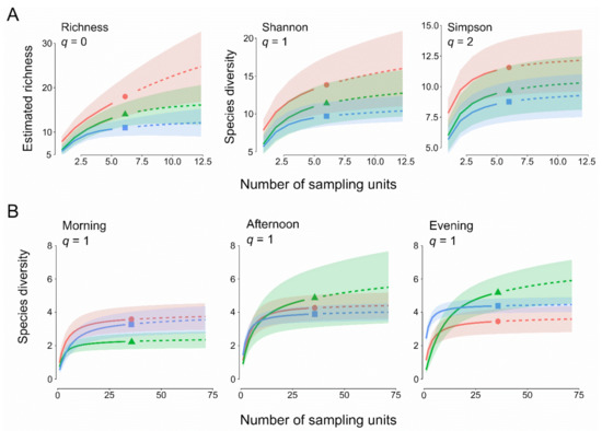 Sample-based plots for ant species diversity based on Hill numbers (q). (A) Pitfall trap sampling, (B) bait sampling, subdivided by daily period (morning, afternoon, and evening). For bait sampling, only q = 1 (Simpson index) is reported. Red circles, lines, and buffers: mature forest (MF); Green triangles, lines, and buffers: harvested forest (HF); blue squares, lines, and buffers: olive plantations (OL).