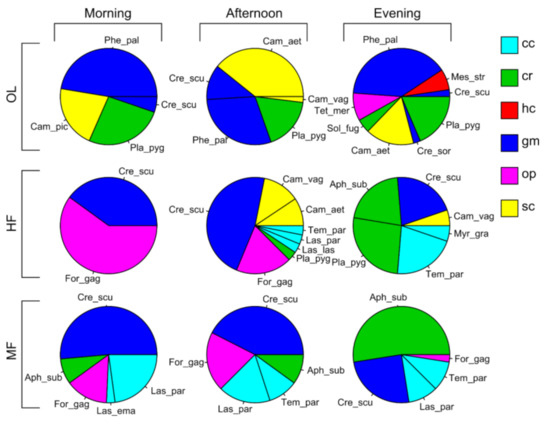 Pie charts of the proportion of incidence of species on the total (i.e., the sum of the incidence of each species in the two transects in that habitat and in that period) in the three habitats and for the three daily periods. Different colors represent functional groups: cc, cold-climate specialist; cr, cryptic species; hc, hot-climate specialist; gm, generalized Myrmicinae, op, opportunist; sc, subordinate Camponotini. Species abbreviations: Aph_sub, Aphenogaster subterranea; Cam_aet, Camponotus aethiops; Cam_pic, Camponotus piceus; Cam_vag, Camponotus vagus; Cre_scu, Crematogaster scutellaris; Cre_sor, Crematogaster sordidula; For_gag, Formica gagates; Phe_pal, Pheidole pallidula; Las_las, Lasius lasioides; Las_par, Lasius paralienus; Myr_gra, Myrmecina graminicola; Pla_pyg, Plagiolepis pygmaea; Sol_fug, Solenopsis fugax; Tem_par, Temnothorax parvulus: Tet_mer, Tetramorium meridionalis.