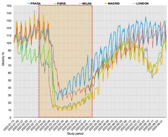 The study topic of this paper has been focused on active factors such as the mobility trends in European cities and the evolution of airborne pollutants such as PM10 and NO2. Therefore, the results from the mobility evolution before, during, and after lockdown is shown in the following sections; after that, the results from the pollution study is shown in Section 4.1, Section 4.2, Section 4.3, Section 4.4 and Section 4.5