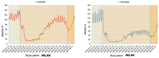 Figure 2. Mobility evolution in Milan from January until September 2020. Source: Own elaboration with data collected from Apple’s mobility trend [22].