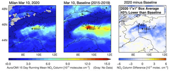 Figure 3. Nitrogen dioxide concentrations over Italy on 10 March of 2020 compared with 10 March of the baseline period (2015–2019). Source: Nasa AURA [23].