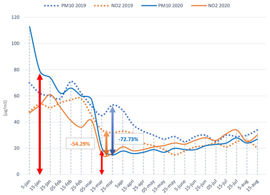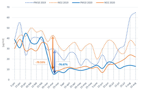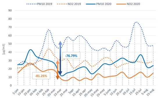 Thus, the evolution of the NO2 and PM10 levels and their analysis can be seen in Figure 13, from the first 8 months of the years 2019 and 2020. This figure, as other figures in this paper, has been elaborated with data from the air quality historical data platform [18].