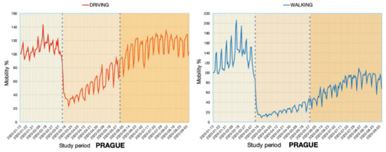 In the case of transport, Prague faced a lowering in public and private transport as the citizens were informed of mobility restrictions in order to avoid major infection of SARS-CoV-2 (COVID-19). This reduction can be observed in Figure 5, which shows the evolution of transport in the country. The driving and walking trend along with the pre-lockdown, during the lockdown, and after a lockdown period is detailed and marked in different tones of orange.