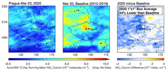 Figure 6. Nitrogen dioxide concentrations over Prague on 20 March of 2020 compared with 20 March from the baseline period (2015–2019). Source: NASA AURA [23].