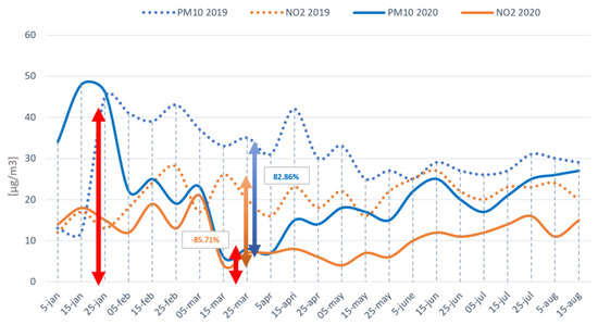 As can be seen in Figure 4, levels of PM10 and NO2 were very unstable during the beginning of the year, especially in the case of PM10 levels, which were above 100 µg/m3 However, when the month of March started, levels both of NO2 and PM10 decreased uniformly to levels lower than 20 µg/m3. It is relevant to keep in mind that even if the values during the beginning of March were lower in 2020 than in 2019, during the following months, even with those low amounts, the levels of PM10 and NO2 were comparable to those during the same period during the previous year, probably due to a reduction in emissions during the summer season. This is probably caused because of a decrease in mobility in that area during holidays that took place in summer. Therefore, a reduction in these pollutants was recorded in more than 50% in each case compared to the previous year.