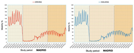 Figure 8. Mobility evolution in Madrid from January until September 2020. Source: Own elaboration with data collected from Apple’s mobility trend [22].
