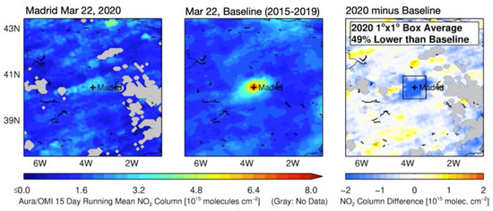 Figure 9. Nitrogen dioxide concentrations over Spain on 22 March of 2010 and on 22 March from the baseline period (2015–2019). Source: NASA AURA [23].