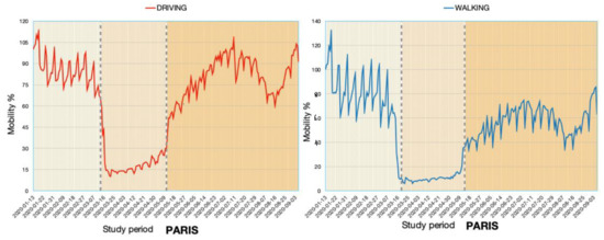 Figure 11. Mobility evolution in Paris from January until September 2020. Source: Own elaboration with data collected from Apple’s mobility trend [22].