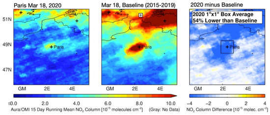 Figure 12. Nitrogen dioxide concentrations over Paris on 18 March of 2020 and on 18 March from the period of baseline (2015–2019). Source: NASA AURA [23].