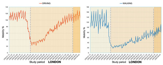 London was the last city to declare a state of alarm with strict restrictions that took place on 23rd of March. With the rapid increase in COVID-19 cases, London became one of the most infected cities in England. The initial increase in cases took place on 6 March with a total number of 551 cases, and these cases increased drastically up to 39,419 cases in the period of time from March until the start of September. Along with large numbers of cases, London also suffers from pollution originating from traffic in various parts of the city, creating high levels of pollution. As mentioned before, vehicle movements cause particles such as NO2, along with PM10. Due to the pandemic situation, the national traffic system decreased its service, as it is shown in Figure 14 elaborated with data extracted from the mobility website of Apple’s mobility trend [22].