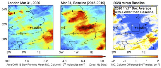 Figure 15. Nitrogen dioxide concentrations over London on 31 March of 2020 and on 31 March in the period of baseline (2015–2019). Source: NASA AURA [23].