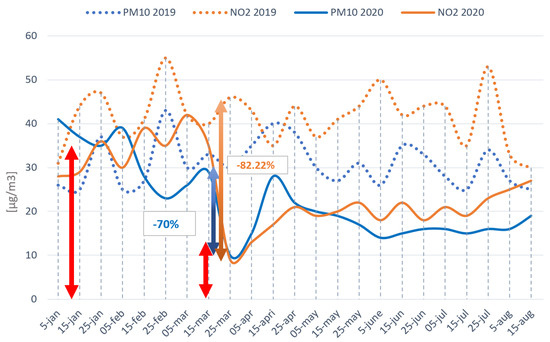 In reference to the pollution analysis, Figure 7 shows the evolution of the values of PM10 and NO2 during the first eight months of 2020.