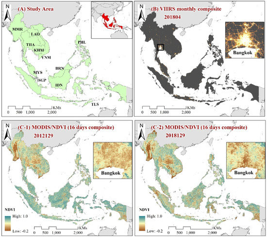 (A) Study area of Southeast Asia, (B) original Visible Infrared Imaging Radiometer Suite - Day/Night Band (VIIRS/DNB) monthly composite data for 2018.04, and (C) 16 days composite of moderate resolution imaging spectroradiometer (MODIS)/normalized difference vegetation index (NDVI) data for 9 May 2012 (2012129) and 10 May 2018 (2018129).