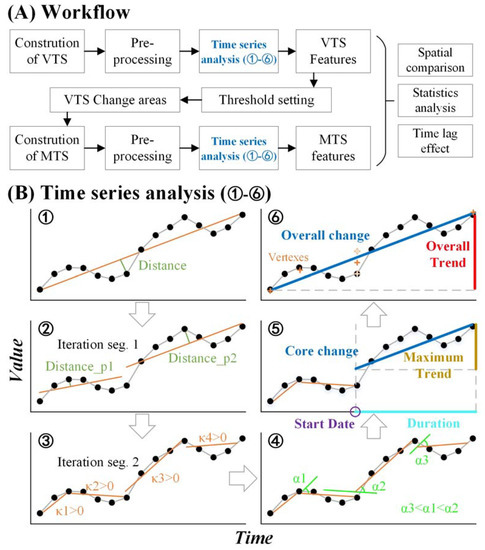 Once this merge process was finished, there were several new vertexes for segmented fitted lines, and the “Overall Trend” was fitted based on these vertexes. For middle vertexes, there might be two values for adjoining parts at one date, and the average value was reassigned. Meanwhile, for merge complement status, the segment with maximum absolute change value and same change direction with “Overall Trend” is set as the core change period in Figure 2(B6). To evaluate the time lag effect, 3 indexes of this core change period were calculated: “Maximum trend”, defined as the absolute change value of fitted line for the core change period; “Start date”, defined as occurrence date for the core change period; and “Duration”, defined as the duration time of the core change period in Figure 2(B5). That means, for a certain VTS or MTS, 4 main selected features are extracted to describe the features.