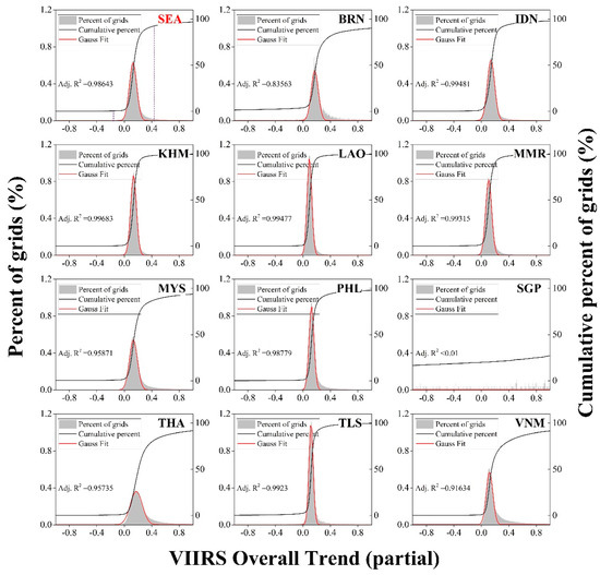 Frequency histogram shows the percent of all grid counts under different VIIRS/DNB overall trend ranges (trend interval: 0.01, partial not total, grid count: ≈21.41 × 106), and the cumulative frequency curve shows the cumulative percent of grid counts for the whole Southeast Asia (SEA) region and 11 countries. The Gaussian fit curve shows the fitted distribution of the VIIRS change.
