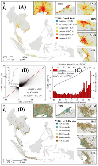 The spatial distribution of the (A) VIIRS/DNB overall trend and (D) duration of the maximum trend (M_Tr). The statistics also show (B) relations between VIIRS/DNB overall trend and maximum trend, and (C) histogram of M_Tr duration and cumulative frequency of start month for M_Tr for SEA region for VIIRS change areas (grids count: ≈1.85 × 106).