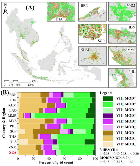 The same features of MODIS/NDVI time series were extracted based on V-change regions, where the maximum trend for all target grids shows statistical significance (0.05). According to statistics, the average value of the overall VIIRS/DNB trend for the SEA region was about 2.12, with a related MODIS/NDVI trend of 2.27 × 10−2 (Table 3). That meant that although the human activities intensified in the SEA region, the vegetation cover still increased. Among all countries, Myanmar (MMR), VNM, and Thailand (THA) contributed the largest rate of vegetation cover increment. Only Cambodia (KHM) and SGP showed a decrease of vegetation cover both for total and positive VIIRS/DNB trend areas (Table 3). For negative VIIRS/DNB trend areas, the corresponding MODIS trend for all countries showed an increment, indicating the promotion of vegetation cover in areas with declining human activity (Table 3). For positive VIIRS/DNB trend areas, the average VIIRS/DNB trend for the SEA region rises to 2.38, while the related MODIS trend dropped to 2.15 × 10−2. Thus, we set these two values as the threshold, combining with the above-mentioned V-change threshold, and each trend could be divided into three parts: VIIRS/DNB—high increase (>2.38), slight increase (0.40-2.38), decrease (<−0.20); MODIS/NDVI—high increase (>2.15 × 10−2), slight increase (0–2.15 × 10−2), decrease (<0). Thus, the composite of VIIRS/DNB trend and MODIS/NDVI trend could be divided into nine categories (Figure 5B).