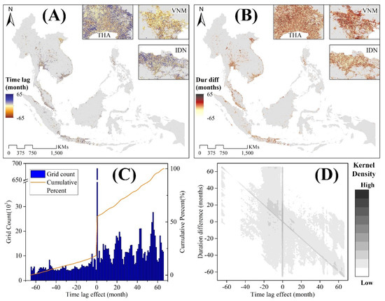 The time lag effect was obvious between the VIIRS/DNB and MODIS/NDVI trend in the SEA region, with an average of about 10.26 months (Table 4), comparing with 2-year time lag effect of non-human impacts [45]. This time lag effect could measure the feedback time of the vegetation cover change to the human activities. Meanwhile, the average duration of the MODIS trend was about 9 months shorter than that of the VIIRS/DNB trend for SEA region (Table 4). The spatial distribution of the time lag effect also showed a less regular pattern, with a Moran’s I value close to 0, but areas closer to cities were more likely to have a smaller time lag effect (Figure 6A, Table 2). That meant more populated area tended to have faster responses to the human activities and ecological degradation. Amongst them, 37.10% of the grids had no time lag effect, and the start month of the MODIS trend for 44.79% of the grids were posterior to that of the VIIRS/DNB trend (Figure 6C). The spatial distribution of duration difference between the start month of VIIRS/DNB and MODIS/NDVI maximum trend showed a uniform pattern due to the limit of the study period (Figure 6B). We also conducted the bivariate kernel density analysis between the time lag effect and duration difference. The plot showed two straight lines with high kernel density: a line with zero lag effect and a line with a slope of negative one (Figure 6D). The sum value of the diagonal line was about zero, which represented the same end time (end of research time, 2018.04) and a large probability of these two trends ongoing. While the vertical line represented that although the start time of the VIIRS/DNB and MODIS/NDVI change was likely to be the same, the duration difference was various, and the MODIS/NDVI change was likely to have longer durations (Figure 6D).