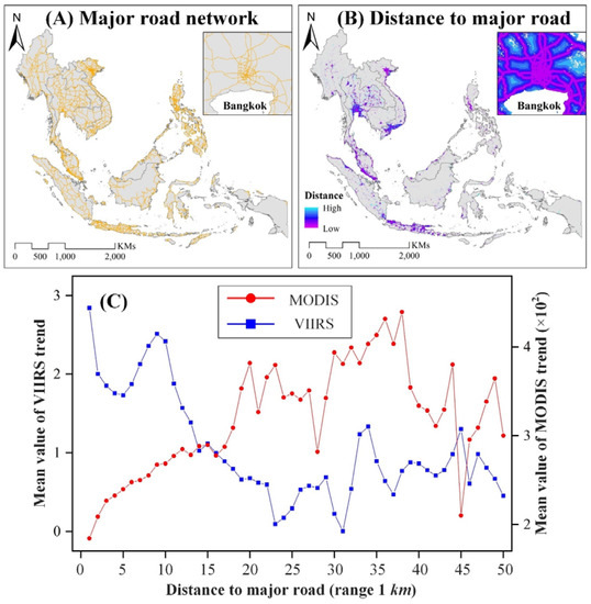The spatial distribution of a major road network from OpenStreetMap in the Southeast Asia (SEA) region (A) and distance from VIIRS change grids (grids count: ≈1.85 × 106) to major roads (B). (C) Mean value of VIIRS/DNB and MODIS/NDVI overall trends under different distance (kilometers, KMs) to the nearest major roads.