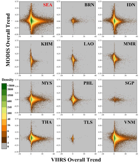 When comparing different combination of VIIRS trend and MODIS trend, the grid density heat map revealed a rhombus pattern for most countries and the whole SEA region, where the center has the highest grid density (Figure 8). For different countries, IDN, MYS, Philippines (PHL), THA, and VNM showed a more similar pattern with the whole region, while other countries showed a constrictive pattern due to little human activities change or small land area. For the whole region, the density distribution showed a symmetry both on the x-axis (VIIRS/DNB trend) and y-axis (MODIS trend), where negative VIIRS/DNB trend areas represented a tighter distribution (Figure 8). Meanwhile, this rhombus pattern had four obvious boundaries, and the trend value of both VIIRS/DNB and MODIS/NDVI were basically inside these boundaries (Figure 8). These boundaries could be seen as a reasonable and common balance between human activities and related vegetation cover change.