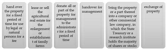 The NASC was established on 1 September 2017, as the successor of the Agri-cultural Property Agency (APA) and the Agricultural Market Agency. Among the many tasks that the NASC has been authorized to perform in the field of land management [29], the most important ones are listed in Figure 1.