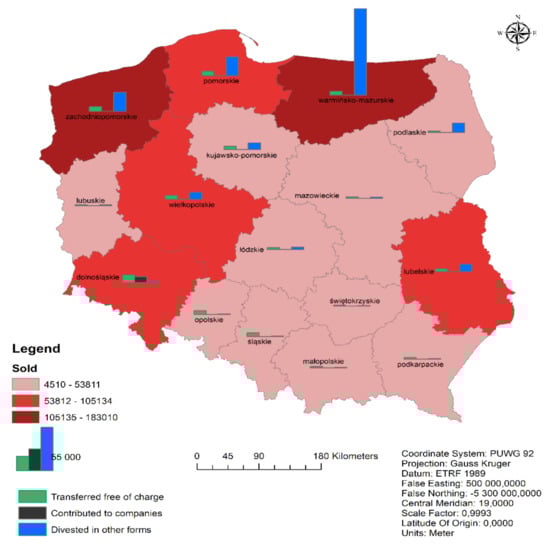 The largest sale of land occurred in Warmińsko-Mazurskie and Zachodniopomorskie Voivodships, with over 170 thousand hectares sold. A moderate level of sales was achieved by Wielkopolskie, Pomorskie, and Dolnośląskie Voivodships, where between 90 and 105 thousand hectares were sold; the remaining voivodships did not sell more than 55 thousand hectares each. With land transferred free of charge to municipalities, mainly for social purposes, most of the land was given away in Dolnośląskie Voivodship, whereas the remaining voivodships most often donated above 1 thousand hectares, not exceeding 6 thousand ha, except Świętokrzyskie Voivodship, where only 725 hectares were transferred. Land “contributed to companies” is the group of activities where the least land was transferred, except Dolnośląskie Voivodship (7819 hectares) and Wielkopolskie Voivodship (528 hectares). The level of support to companies did not exceed 65 hectares donated to a company, and no land was transferred under this category in Łódzkie Voivodship. With respect to land permanently disposed of in other forms, more than 100,000 hectares of land were transferred in Warmińsko-Mazurskie Voivodship, which can be considered an exceptional case.