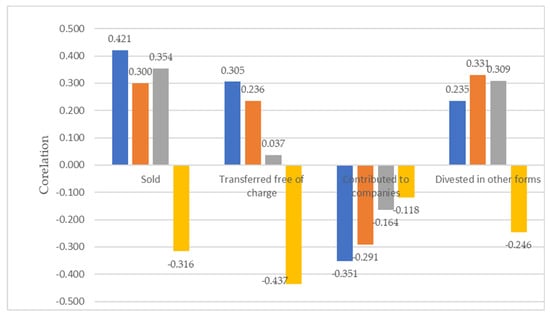 However, while comparing changes in the rankings, the correlation proves to be inversely proportional, which means that the NASC activities were conducted mainly in areas where the level of agriculture was the lowest. This proves that the measures were addressed mainly to the weakest voivodships and have been implemented consistently; therefore, the position in the rankings of voivodships where there is a large range of land transfer is improving. According to J. Guilford’s scale, the 2006 ranking was at level III, i.e., moderate correlation (significant dependence), except for paid transfers in other forms, where the correlations with the 2006 ranking reached level II, i.e., low correlation (clear relation). In the 2018 ranking with free contributions to companies, it is at level II, i.e., low correlation (clear relation). Land sold and transferred in other non-free forms reached level III, i.e., moderate correlation (significant relation). If we compare the data on agricultural development with the data from the 2006–2018 ranking, we observe level III of correlation, i.e., moderate correlation (significant dependence), except for contribution to companies, which is at level II of correlation (clear relation). If we compare it with a change in the ranking, all the features will be at correlation level II, except for transfer free of charge, which was at correlation level III, i.e., a significant correlation. However, if we use the scale described by Cohen [55], the correlation for transfer free of charge will even reach level four, i.e., 0.43, which is a high correlation (significant relationship).