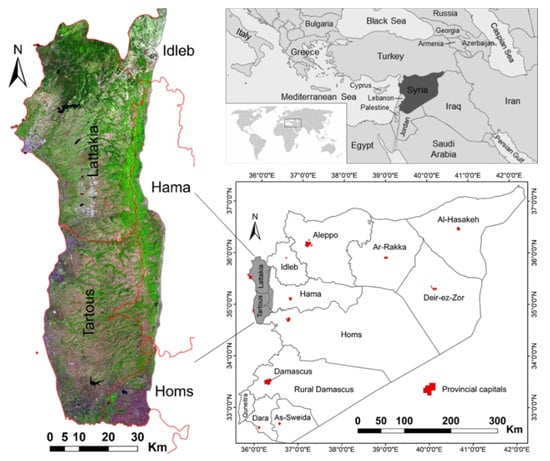 Forests are among the most seriously threatened natural land uses in Syria due to human-induced deforestation activities, particularly those associated with the ongoing conflict since mid-2011. These activities are often represented by frequent forest fires occurring on a large scale as well as the illegal production of wood and firewood, which have transformed from individual encroachments by the population into collective encroachments that have destroyed thousands of hectares of forests [45]. Thus, it is expected that forests in the Syrian coast region, which represent more than 75% of the total area of Syria’s forests, have undergone remarkable changes during the conflict, and it is also expected that these forests have suffered from continuous depletion. To date, due to the ongoing conflict and the political situation in Syria, there are no studies that provide accurate, reliable, and comprehensive data on the temporal and spatial dynamics of forest change in this region and analyze the driving forces behind this change. Therefore, this study aims (1) to monitor LULC changes in the Syrian coast region using multi-temporal Landsat images during the period between 2010 and 2020, (2) to analyze the spatial and temporal dynamics of forest cover in order to determine the patterns of change in this cover, (3) to evaluate the density and distribution of forest cover, and (4) to identify the potential proximate drivers behind the dynamics of change in forest cover with a focus on direct and indirect drivers associated with the conflict situation in the country. By understanding the effects of the driving forces on changes in forest cover in the study area, this study can help in identifying the areas of initial intervention to protect the forests in the Syrian coast region from loss and degradation. In addition, this study can contribute to effective strategic planning for sustainable development of forest resources in Syria.