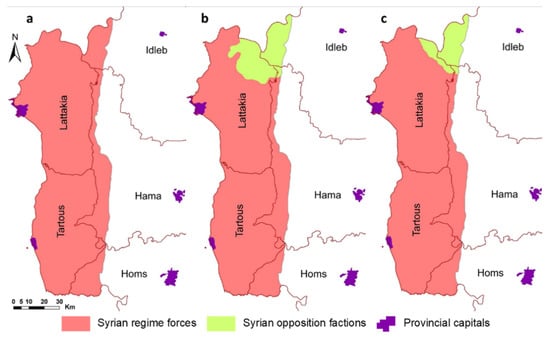 Figure 3. Distribution of zones of influence in the Syrian coast region between the warring parties at the end of 2010 (a), 2015 (b), and 2020 (c) adapted from [56].
