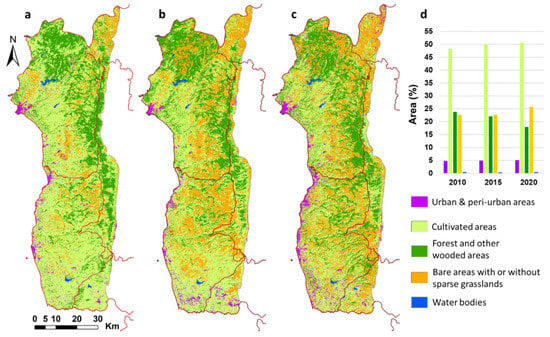 Figure 5. LULC in the Syrian coast region for 2010 (a), 2015 (b), and 2020 (c). The area (in %) of LULC categories after computing adjusted area estimates is given in (d).
