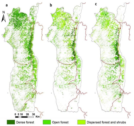 Figure 7. Changes in forest cover density in the study area for 2010 (a), 2015 (b), and 2020 (c).