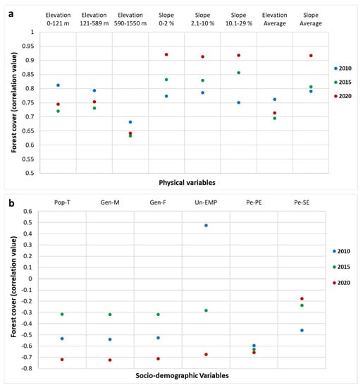 Figure 8. The relationship between forest cover extent and physical variables (a) and socio-demographic variables (b) between 2010 and 2020 in the Syrian coast region. Where Pop-T is total population, Gen-M is males, Gen-F is females, Un-EMP is unemployed, Pe-PE is primary education, and Pe-SE is secondary education.