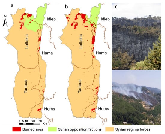 Figure 9. Burned forest areas in the Syrian coast region for 2015 (a), 2020 (b), and fires of oaks (Quercus) and Aleppo pine (Pinus halepensis) forests adapted from [64] (c).