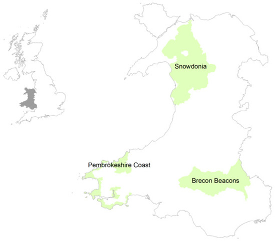 Wales is a relatively small country (approximately 21,000 ) in the United Kingdom, bordered by England to its east and surrounded by the Irish Sea and the Bristol Channel to its north, west and south. It is famed for the mountainous and coastal landscapes with three National Parks—Snowdonia, the Brecon Beacons and the Pembrokeshire Coast—bringing numerous economic value and benefits of tourism (see Figure 1). The main population areas are situated in South Wales, including cities such as Cardiff, Swansea, and Newport, with another significant population area in North East Wales.