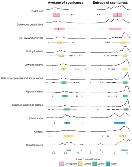 The exploratory analysis provides some insights into the central tendency and variability in the public perceived scenicness underneath the presumably homogenous aspect areas characterised by the landscape architects according to the similarity of physical attributes. Broadly speaking, areas of water received the highest scores on average scenicness, followed by those of upland, lowland, and development, with a sole exception of “coastal” areas that recorded higher scenic values than the upland areas but are categorised as lowland. Concerning the underlying variability indicated by entropy metrics, upland areas were found to be highly variable, followed by lowland, water, and development areas.