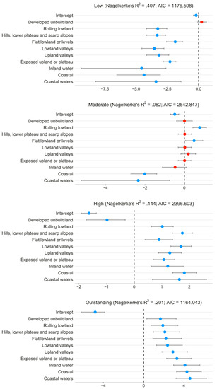 In Figure 3, the model for the low scenic quality shows the best performance among the four logistic models, as indicated by the goodness-of-fit measures of and Akaike information criterion ( [36,37]. This appears to be plausible given that the abundant aspect areas of “developed unbuilt land” and “built land” were consistently associated with low scenic quality. By contrast, the model for moderate scenic quality exhibited the lowest performance () where only the odds ratios associated with four of the landforms (that is, “coastal water,” “coastal,” “flat lowland or levels,” and “rolling lowland”) were statistically significant, as denoted by the colour blue. Concerning high and outstanding scenic quality, all landform types were statistically significant at 5% significance levels. A glimpse of performances over the four models suggests that these landform typologies explain the probabilities for the middle scenic qualities less than those for both ends of the spectrum.