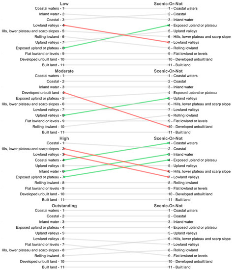 The marginal effects of the landform typologies on the public scenic ratings and the expert evaluations of scenic quality could be used to further produce different ranking orders. These relative rank positions enable the comparison of the orders from both perspectives. Figure 4 illustrates the changes in order between both sides across four levels of scenic quality. The larger rank-order differences (that is, change greater than or equal to 3 positions) are highlighted in green (≥3) and red (≤−3) and the rest are shaded in grey, showing which typology may be contesting from both perspectives. A relatively small amount of significant change in rankings is seen at the outstanding scenic quality, suggesting there exists mutual consent at the highest end of the spectrum. There is, however, a large amount of significant disparity in ranking at the level of high scenic quality. Moreover, the landform typologies associated with water bodies are generally ranked in the top three whilst those associated with man-made landscapes are bottom-ranked.