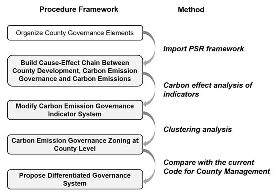 The framework of “identifying the cause-effect chain among county development, carbon emission governance, and carbon emissions—establishing carbon emission governance indicator and carbon emission governance zoning systems for the counties—setting a differentiated governance system” consisted of the following steps (Figure 1): (1) introduce the county governance elements into the PSR framework and identify the cause-effect chain so that the governance elements in the chain would be used to build the initial carbon emission governance indicator system, (2) further screen the initial governance indicators that do affect carbon emissions by analyzing their carbon effects to establish a modified indicator system, (3) collect data for the counties’ indicators and classify all the counties with the clustering analysis method to draw a carbon emission governance zoning map at the county level, and (4) reference the current Code for County Management, so that the differentiated governance system, including key governance indicators and the low-carbon target thresholds of the indicators, would be established for each zone.