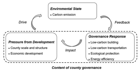 In the past decades, scholars from different disciplines have conducted a large number of carbon emission governance studies in different regions and on different spatial scales, and the studies mainly focus on the following three categories: low-carbon city indicators, governance methods, and case studies. First, a large number of studies on low-carbon indicators have been conducted on urban clusters [1,2,3], large cities [4,5], and other large-scale objects, such as research on low-carbon urban assessment [6,7] and carbon emission estimation methods [8,9]. Second, studies on governance methods have proposed some carbon emission governance tools [10,11] or models [12,13,14,15], targeting one aspect, such as production or building, of governance, at the city level [16,17,18]. Third, many carbon emission governance case studies have been conducted on small-scale objects, such as urban centers [19], communities [20,21,22], and industrial parks [23,24]. Also, more than 80 low-carbon pilots were set up in China from 2010 to 2017 and some research was conducted to analyze the carbon emission governance effects of the pilots. The studies attempted to realize the universal application of carbon emission governance through the governance method in a case-study city or the governance mode of a specific topic. To date, the research on carbon emission governance has focused on large scales, such as cities and regions, or some specific small-scale areas, and has provided many theoretical and methodological bases. However, the main drivers of carbon emissions in cities and counties are different because the overall levels of the development of the cities are higher than those of the counties whose levels of development are varied. It is indicated that the proposed low-carbon city indicators were not completely applicable to counties and that the policy tools and governance models for low-carbon cities could not work for all counties. To draw on the experiences of low-carbon cities, carbon emission governance for the counties requires further discussion considering the characteristics of the county.