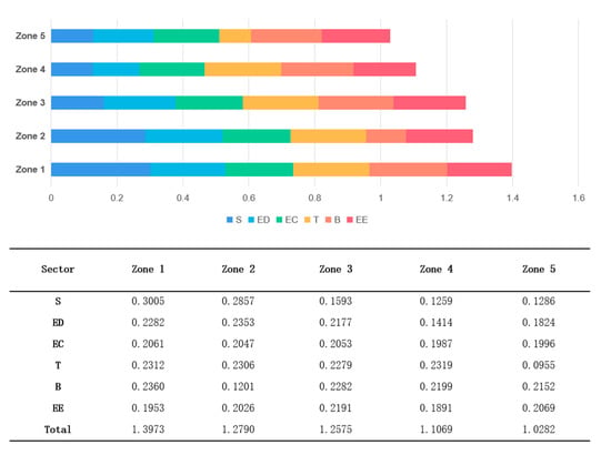 In every zone, the average and total value of each sector of the counties were calculated to reflect the zones’ carbon emission governance problems in each sector and the overall level of low-carbon development. The higher the average value of the sector, the more critical is the governance problem in it. For a zone as a whole, a high total value means relatively high carbon emissions. The table in Figure 3 shows the average and total values of the 5 zones in the 6 sectors.
