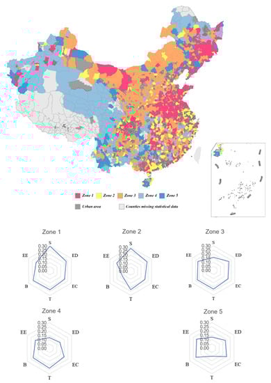 The first zone is revealed as the high-carbon governance zone, in which the counties are located mainly in the Northeast Plain and the North Plain Area. Each sector value is high in the zone. The sector values of “Scale and structure (S)”, “Ecology (EC)”, and “Buildings (B)” are the highest of the 5 zones and the sectors value of “Economic development (ED)” and “Transportation (T)” are the second highest. The large-scale developments, ecological erosion, and housing energy consumption mainly caused the carbon-intensive model of development. Meanwhile, economic development and transportation play an important role. It could be inferred as these counties adopt the development path of expansion. They have expanded production through extensive land expansion to drive the growth of the secondary industry. This growth caused the erosion of carbon sink resources as a result of the lack of attention paid to ecological protection. In addition, extensive land expansion has led to the selection of bigger houses and the scattered distribution of buildings, resulting in high energy consumption caused by residential heating and long-distance transportation.