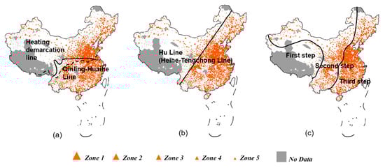 From the use of the grading symbol to show the differences in the carbon emissions from the first to the fifth zones, it can be seen that the spatial distribution of carbon emission governance zones had a high coupling degree with the 3 classical Chinese geographical zonings. The first zone is a high-carbon zone, the second and third zones are medium-carbon zones, and the fourth and fifth zones are low-carbon zone. And the Chinese graphical zoning are the winter heating demarcation line based on the Qinling-Huaihe line [74] (Figure 5a), the comparison line proposed by Huanyong in 1935 to divide the population density [75] (Figure 5b), and the Chinese geomorphic zones to distinguish the overall topography of the country [76] (Figure 5c). The Qinling-Huaihe Line (north area) and the heating demarcation line (winter heating area) (Figure 5a) are the important dividing lines that distribute the main areas of the high-carbon zone and medium-carbon zone. The high-carbon zone and medium-carbon zone are mainly distributed in the east of Hu Line (high population density area) (Figure 5b) and the third step area (flat terrain area) (Figure 5c). According to the conclusions of Qin [77], Wang (2017) [27], and Yang [78], differences in carbon emissions due to heating and population density have been supported. This comparison reflects not only the differences in the carbon emission governance demands due to winter heating, population density, and geographical conditions, but also partly reflects the reasonableness of the zoning results.