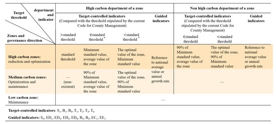 Zoning is a process of reflecting the qualitative differences in county governance by the analysis of quantitative data, so differentiated zoning governance strategies should be pushed back by the analysis of qualitative differences. Since zoning governance should consider the difficulty of both the emission reduction of different indicators and of steady socio-economic development, it is obviously unreasonable and incomplete to put forward completely quantitative or qualitative strategies for all the indicators. Following the current county governance document, this study divided all the indicators into target-controlled indicators and guided indicators. Sector in a zone would be considered a high carbon sector if its value were higher than the average value of the 5 zones; otherwise, it is a non-high carbon category. The standard threshold of target-controlled indicators can be calculated by taking population as a benchmark (population indicator would not be considered in the adjustment strategy because of the small elasticity of population growth). The guided indicators do not have a standard threshold, but the national average value or the mean rate of change can be used as a reference. Therefore, according to the levels of the low-carbon development of the 5 zones and their various governance problems, this study formulated quantitative goals and qualitative guidance objectives respectively, for the two types of indicators, thereby forming a differentiated carbon emission governance system. Among the zones, the high-carbon zones were assigned reduction and optimization. The medium-carbon zones took optimization as the governance direction. The low-carbon zone was not adjusted. Figure 6 shows the governance strategies for the indicators marked “+” in Table 2. The opposite governance strategies were adopted for indicators marked “−”. The zoning governance strategy is shown in Table 5.