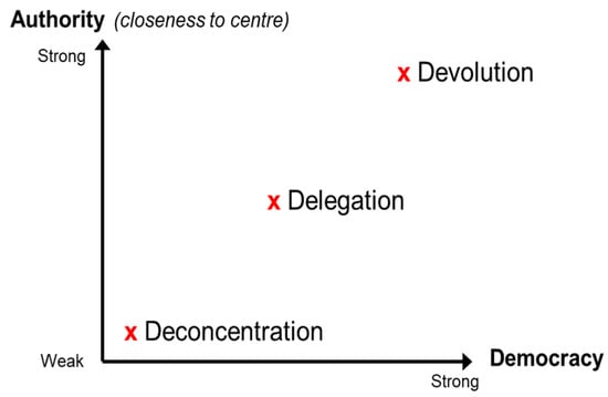 These forms of decentralization represent a continuum of central-local relations in terms of shifts in power, authority and resources, and hence, democratic outcomes intended by decentralization (see Figure 1). Thus, it is a popular policy lever for improving the legitimacy of government and enabling democracy [13], especially in developing countries where the emphasis has tended to be on devolution [14,15,16]. With the promise of delivering political, governance and efficiency values [17], decentralization has also been linked to good governance outcomes and essentially also characterized as principles of good land governance [18]. In the context of land administration, decentralization is increasingly argued as a type of fit-for-purpose strategy for effectively addressing poor land governance at multiple levels [19,20,21,22]. Additionally, with a global push towards formalizing diverse social tenures, there has been an increasing turn towards a collaborative (or partnerships) approach in decentralized land governance, such as utilizing existing local institutions that are already well integrated and recognized by communities, or introducing new structures constituted of local representatives and tasked with dealing with local needs [23].